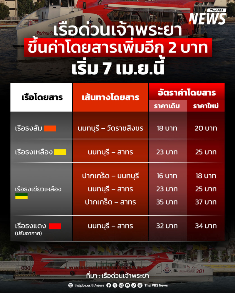 • เรือธงแดง (ปรับอากาศ): นนทบุรี – สาทร จากราคา 32 บาท เพิ่มขึ้นเป็น 34 บาท