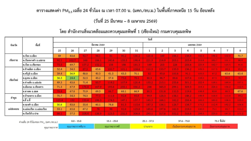พื้นที่ ต.เวียงพางคำ อ.แม่สาย จ.เชียงราย และ ต.ลี้ อ.ลี้ จ.ลำพูน มีค่าฝุ่น PM2.5 เกินมาตรฐานในระดับ สีแดง (ระดับมีผลกระทบต่อสุขภาพ) ติดต่อกันมา 15 วัน ตั้งแต่วันที่ 25 มี.ค.จนถึงปัจจุบันที่ ต.เวียง ต.เวียง อ.เชียงของ จ.เชียงราย ต.เมืองนะ อ.เชียงดาว จ.เชียงใหม่ และ ต.เวียงใต้ อ.ปาย จ.แม่ฮ่องสอน มีค่าฝุ่น PM2.5 เกินมาตรฐานในระดับสีแดง ติดต่อกันมา 13 วัน ตั้งแต่วันที่ 27 มี.ค.ที่ ต.ช่างเคิ่ง อ.แม่แจ่ม จ.เชียงใหม่ ต.บ้านกลาง อ.เมือง จ.ลำพูน และ ต.แม่สะเรียง อ.แม่สะเรียง จ.แม่ฮ่องสอน มีค่าฝุ่น PM2.5 เกินมาตรฐานในระดับสีแดง ติดต่อกันมา 12 วัน ตั้งแต่วันที่ 28 มี.ค.ที่ ต.ช้างเผือก อ.เมือง จ.เชียงใหม่ มีค่าฝุ่น PM2.5 เกินมาตรฐานในระดับสีแดง ติดต่อกันมา 11 วัน ตั้งแต่วันที่ 29 มี.ค.ที่ ต.สุเทพ อ.เมือง จ.เชียงใหม่ และ ต.จองคำ อ.เมือง จ.แม่ฮ่องสอน ค่าฝุ่น PM2.5 เกินมาตรฐานในระดับสีแดง ติดต่อกันมา 10 วัน ตั้งแต่วันที่ 30 มี.ค.ที่ ต.หางดง อ.ฮอด จ.เชียงใหม่ ค่าฝุ่น PM2.5 เกินมาตรฐานในระดับสีแดง ติดต่อกันมา 7 วัน ตั้งแต่วันที่ 1 เม.ย.