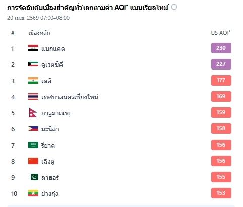 ค่าฝุ่น PM 2.5 ภาคเหนือ ยังสูงเกินค่ามาตรฐาน อยู่ในระดับสีแดง มีผลกระทบต่อสุขภาพ 17 พื้นที่ มากสุด ต.ห้วยโก่น อ.เฉลิมพระเกียรติ จ.น่าน วัดได้ 2175.9 มคก./ลบ.ม. ขณะที่ IQAir รายงาน เทศบาลนครเชียงใหม่ ติดอันดับ 4 เมืองมลพิษโลกวันนี้ (20 เม.ย.2569) เวลา 07.00 น. ศูนย์สื่อสารการแก้ไขปัญหามลพิษทางอากาศ รายงานการติดตามตรวจสอบคุณภาพอากาศ สรุปดังนี้