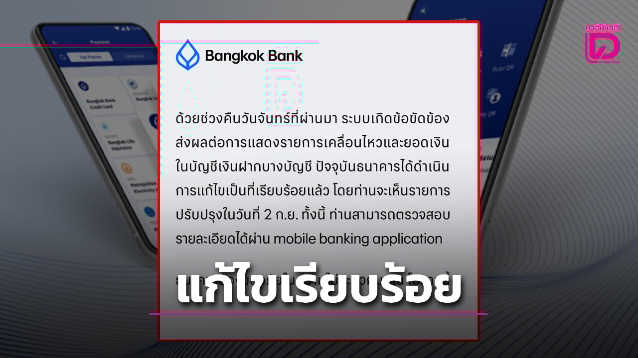 วันที่ 3 ก.ย. ธนาคารกรุงเทพ ชี้แจงว่า “ด้วยช่วงคืนวันจันทร์ที่ผ่านมา ระบบเกิดข้อขัดข้อง ส่งผลต่อการแสดงรายการเคลื่อนไหวและยอดเงินในบัญชีเงินฝากบางบัญชี
