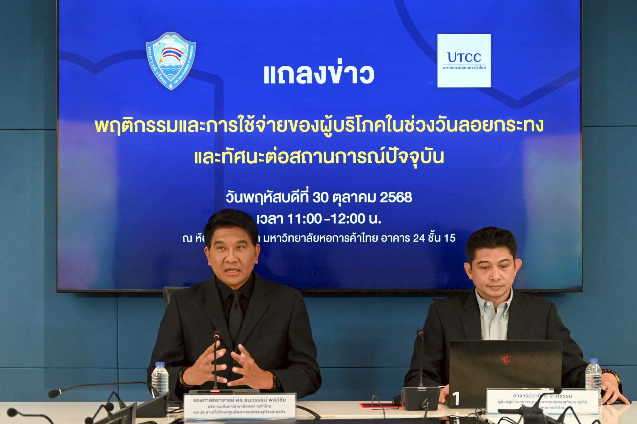 นายธนวรรธน์ พลวิชัย อธิการบดี และประธานที่ปรึกษา ศูนย์พยากรณ์เศรษฐกิจและธุรกิจ มหาวิทยาลัยหอการค้าไทย เปิดเผยถึงผลสำรวจพฤติกรรมและการใช้จ่ายผู้บริโภคในช่วงวันลอยกระทง และทรรศนะต่อสถานการณ์เศรษฐกิจปัจจุบันว่า คาดการณ์มูลค่าใช้จ่ายปีนี้อยู่ที่ 9,677 ล้านบาท ลดลง 6.5% เมื่อเทียบปี 67 ที่มีมูลค่า 10,355 ล้านบาท โดยถือว่าเป็นมูลค่าต่ำสุดในรอบ 4 ปีนับจากปี 65 ที่มีมูลค่า 9,686 ล้านบาท และอัตราขยายตัวติดลบครั้งแรกในรอบ 4 ปี นับจากปี 65 ที่ขยายตัว 5.9%